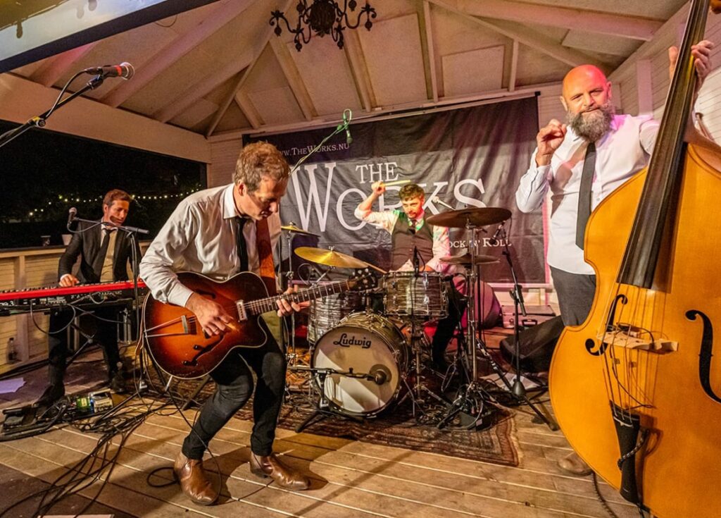 The Works spiller rock’n’roll som det lød, duftede og svingede i 50’erne og 60’erne – med sved på panden, smalle slips og smittende spilleglæde! Bandet blev dannet til Nils Malmros’ film Kærestesorger, men blev hurtigt en publikumsmagnet i eget navn. Med numre fra Elvis, Chuck Berry og Jerry Lee Lewis – plus egne sange – blæser de nyt liv i klassikerne. Det hele leveres med kontrabas, hammondorgel, saxofoner og en sceneoptræden, der får publikum op af stolene og ud på gulvet. The Works er ikke bare musik – det er en fest med charme, energi og masser af rockhistorie i blodet! VI GENTAGER GERNE EN SUCCES – Bandet besøgte os sidste år, da vi fik et sent afbud, og de leverede et brag af en koncert.